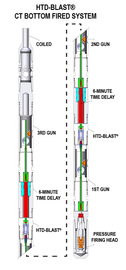 HTD-BLAST System® (Horizontal Time Delay Ballistic Assisted Sequential Transfer) is a Tubing Conveyed Time Delay Transfer System. This system allows the energy from a Perforating Gun to ignite a Time Delay System attached to the gun system. The system is designed to be used in tubing conveyed applications to enable the operator to perforate several zones during a single run by moving the gun string to the next interval during the time delay burn sequence. The perforating system may be initiated from the top or bottom of the gun string. Once initiated, each gun will fire in sequential order at a predetermined time interval.